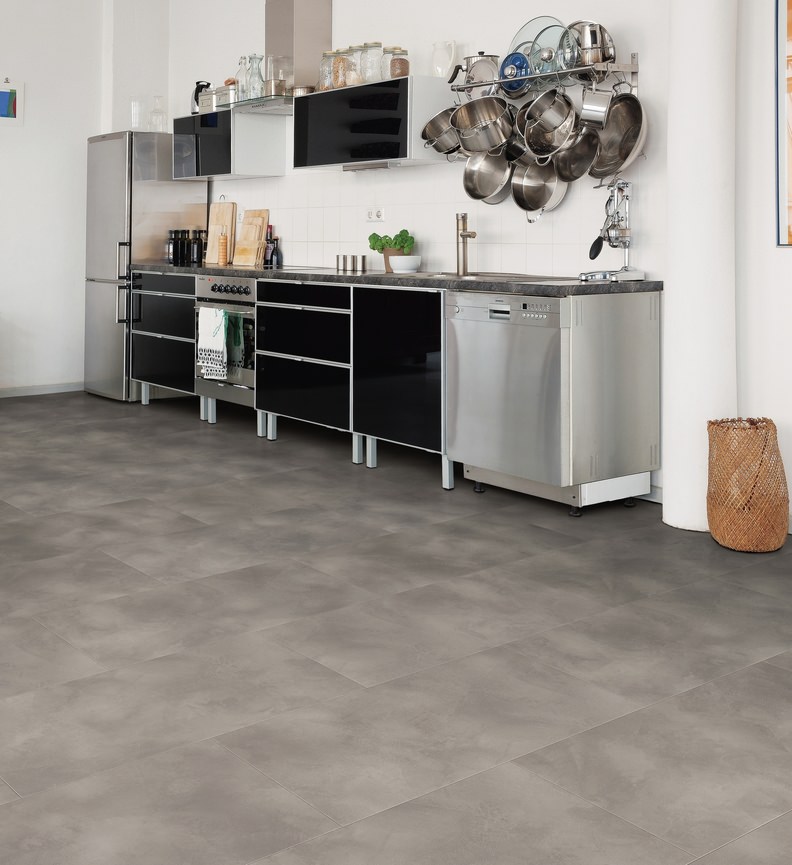 Det smarte designgulv fra DISANO i autentisk fliselook, er slidstærkt og godt som gennemgående gulv i hele din bolig.